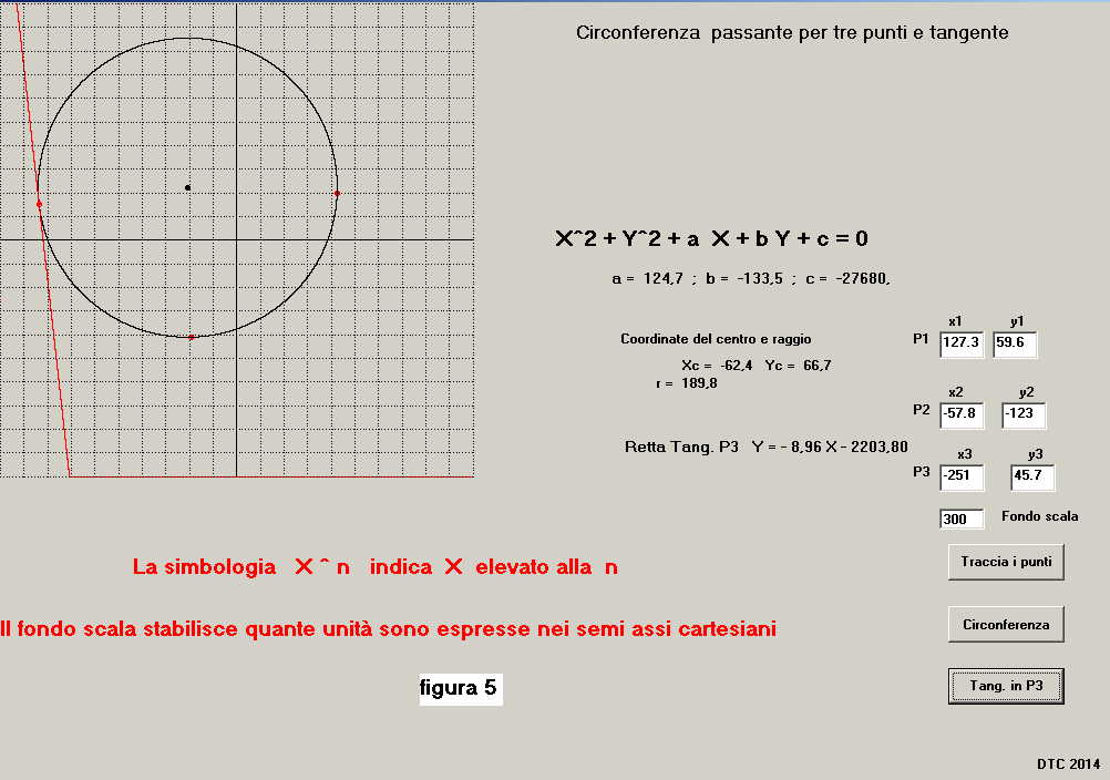il suo tracciato passante per i punti inseriti; l'equazione della circonferenza con il