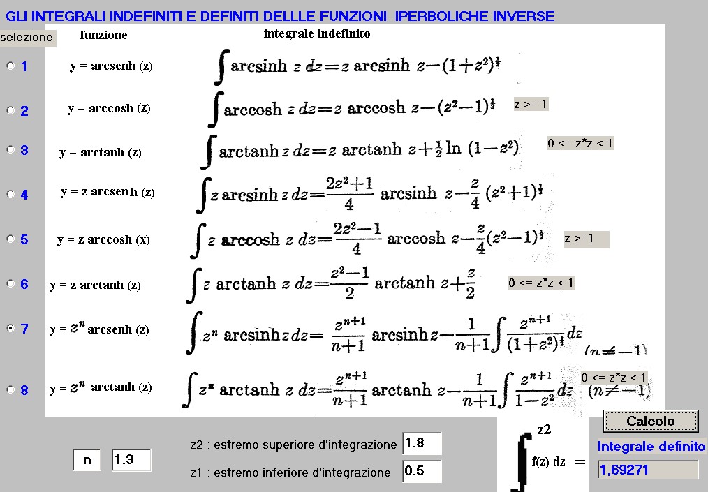 Per ciascuna delle 8 funzioni iperboliche è disponibile, tramite il pulsante di "selezione e calcoli"